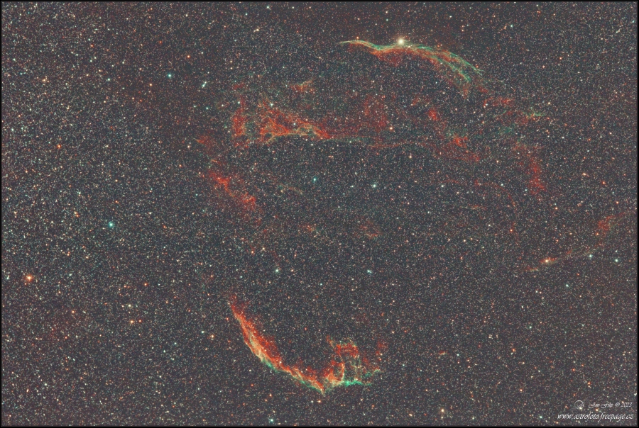 Komplex Řasových mlhovin v souhvězdí Labutě. Na snímku jsou viditelné hlavní části tohoto útvaru: The Western Veil - úplně nahoře, hned pod ním slabě viditelný Pickering's Triangle a konečně dole je část zvaná The Eastern Veil. Pozůstatek exploze hvězdy, někdy před 5 - 8 tisíci lety. Z vesmírného hlediska docela nedávno.