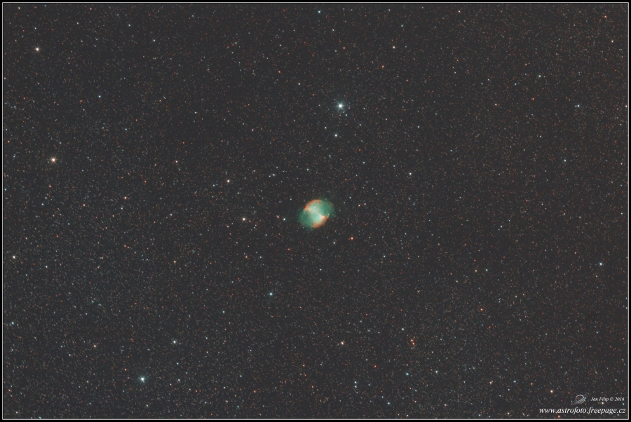 M 27, první planetární mlhovina, objevená Johnem Herschlem. V centru je trpaslík, hvězda, ze které pocází odvržený materiál.