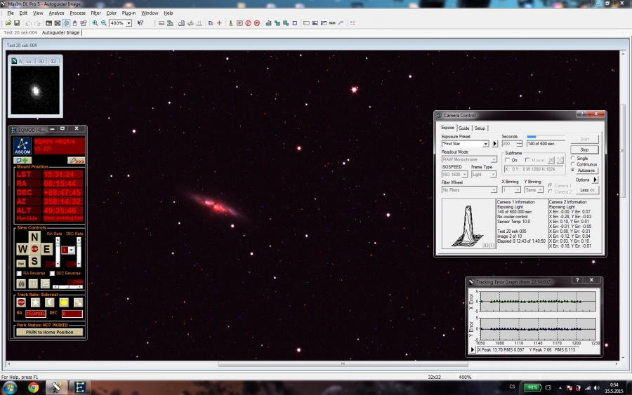 Jelikož padání programu PHD se nepodařilo odladit, došlo k výměně software a to konkrétně za MaximDl. Zkouška dopadla uspokojivě, jen bude zapotřebí vyřešit nějaké drobnosti v automatickém odpojování zrcadlovky (?), trochu ještě zapracovat na ditheringu a jinačejších fičůrkách :) a hlavně si to ještě trochu osahat.