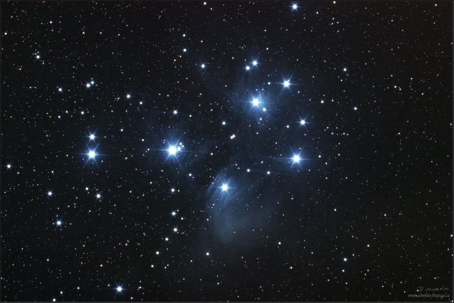 Od komety jsem si odskočil k typicky zimnímu objektu a tím byly Plejády. Prvotním záměrem byl test ovládání pointace a expozic fotoaparátu jedním PC. Bohužel se zdá, že programy APT ve spolupráci s PHD se tluče - pointace se samovolně vypínala, PHD padalo - docházelo k zamrznutí atd. Z toho důvodu není snímek pointován úplně bezchybně.