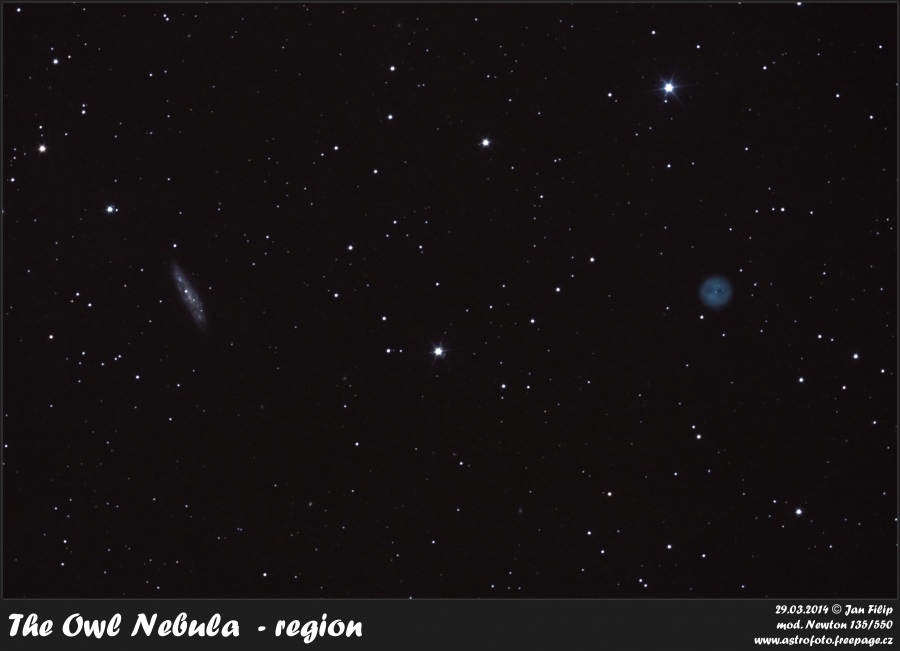 Blízká a vzdálená. Zatím co galaxie vlevo (M108) je 14.1 mil. LY, tak Soví mlhovina (M97) je vzdálena pouhých 2600 LY. A ač se to na první pohled nezdá, tato planetární mlhovina má jednu z nejsložitějších vnitřních struktur. Geometricky má nejblíže k zobecněnému torusu.