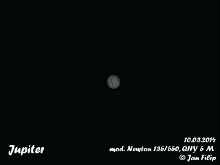 Jupiter - tentokrát pouze s fotokomorou, bez Barlowa s pointační kamerou QHY 2 M II. Nasnímaná sekvence 1000 snímků, vybráno 50%, zostřeno v PS filtrem Focus Magic.