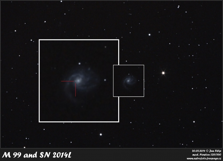 Galaxie je vzdálena 50 mil LY a supernova má jasnost někde kolem 15 magnitudy.