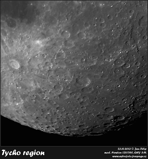 Jedná se o kompozici 2 polí, alespoň jsem vyzkoušel maskování přechodu snímků, vlevo kráter Tycho, vpravo Altajský zlom a hromada toho, co dcery nazývají díry...