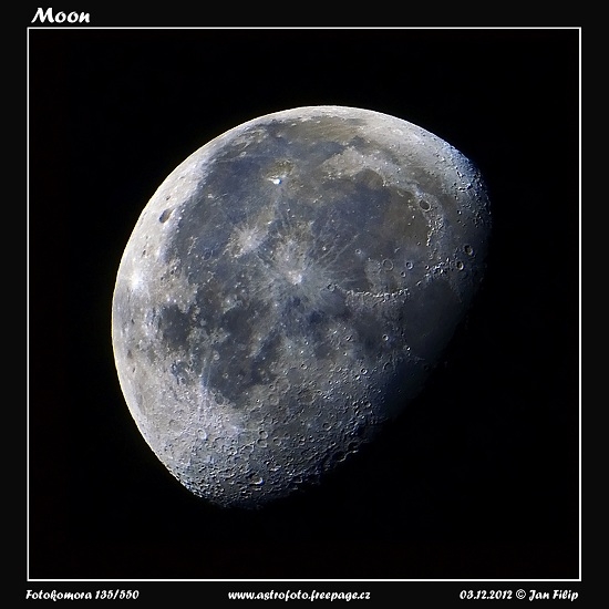 V sérii fotek Měsíce pokračuji, tentokrát již konečně fotokomorou. Se snímkem nejsem spokojen. Za prvé podmínky při focení byly strašné - nejprve se zatáhlo, takže jsem byl rád, že jsem nějakým způsobem ustavil, následně se mi pohlo ostření, tak jsem i s pomocí Bachtina ostřil 15 minut - bez rukavic, tubus dalekohledu je dural či nějaká taková slitina, takže reálně skoro i omrzliny :/, následná kalibrace ne a ne se povést, protože jak na potvoru kalibrační hvězdy nebyly k dispozici (za mraky), prostě hrůza. A pak se zatáhlo ůplně...