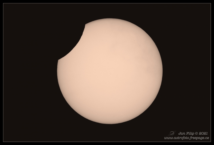 Člověk míní..... V plánu bylo zachycení přeletu ISS, ale počasí nepřálo. 10 minut před úkazem začalo pršet, pak následovalo cca 7 minut pauza, během které jsem musel opět sestavit montáž s dalekohledem a pak už jenom beznadějně zataženo. Do přeletu ISS několik minut chybělo. Díky oblačnosti je také Slunce téměř bez podrobností.