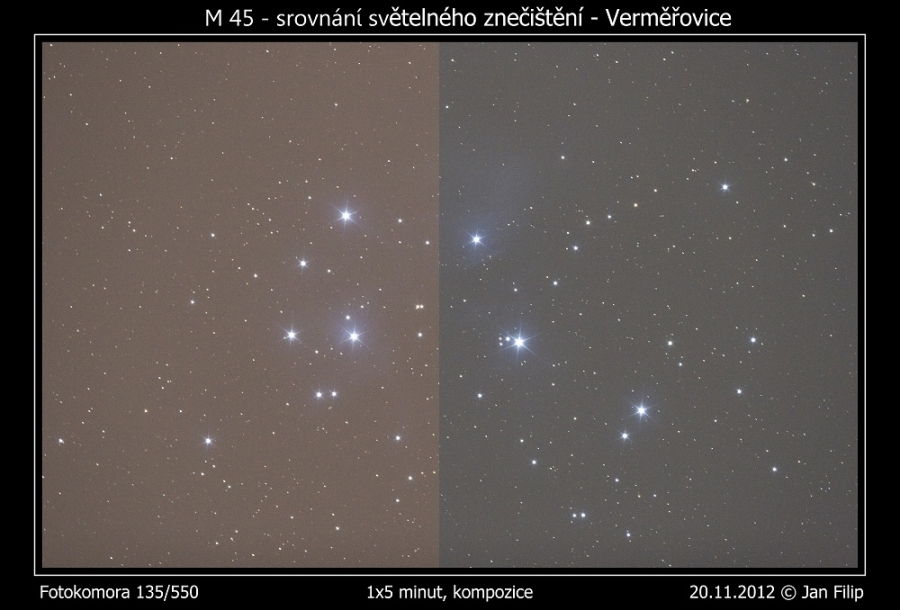 Že světelné znečištění není jenom prázdný pojem, dokazuje tento snímek. Jasně je zde vidět rozdílná kvalita oblohy před zhasnutím pouličního osvětlení a po zhasnutí. A to prosím na vesnici. Oba snímky jsou dělány stejnou technikou, na stejném místě, stejným časem a časový rozdíl mezi nimi jsou 3 minuty :) Takto dokáží oblohu přesvítit cca 4 lampy, vzdálené od místa focení cca 600 m vzdušnou čarou. A to Pleády byly v dostatečné výšce nad obzorem, cca 70 stupňů. Samozřejmě při zpracování fotografií typu té nalevo, nastává boj to přesvětlení odstranit.