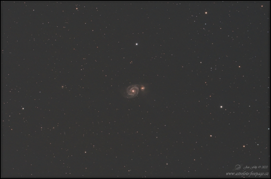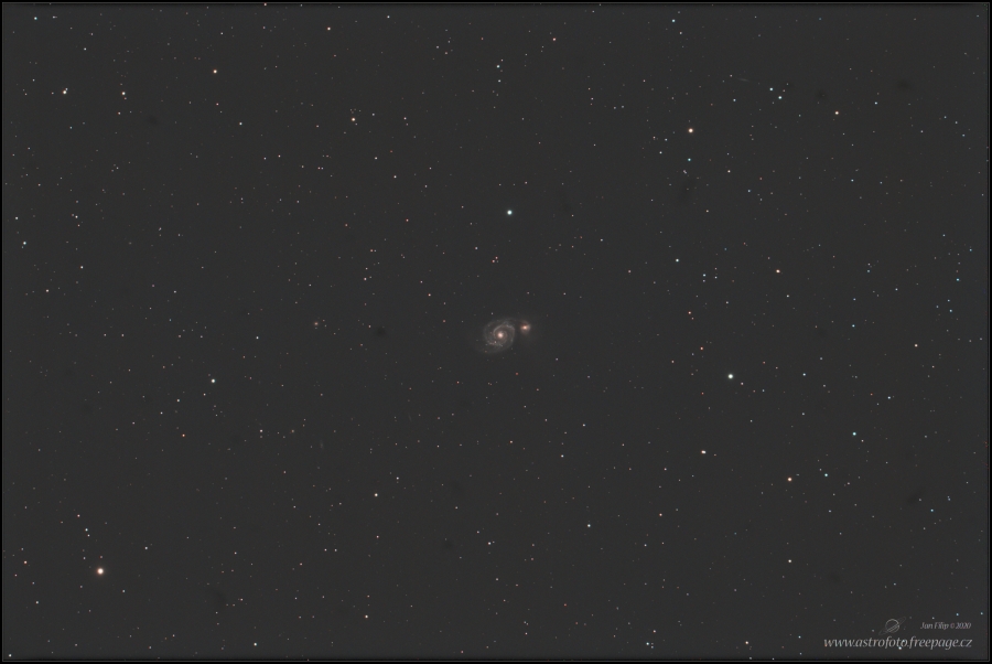 A trochu popisu pro ne astronomy:) Na snímku je dvojice galaxií, s katalogovým označením M 51, jenž jsou spolu gravitačně provázány. Za svojí relativně velkou jasnost - je v celku bez problémů najdutelná i triedrem - vděčí velkým počtem kulových hvězdokup v jejich ramenech. Jo a světlo k nám z ní letí 23 milionu let a nějaké drobné...