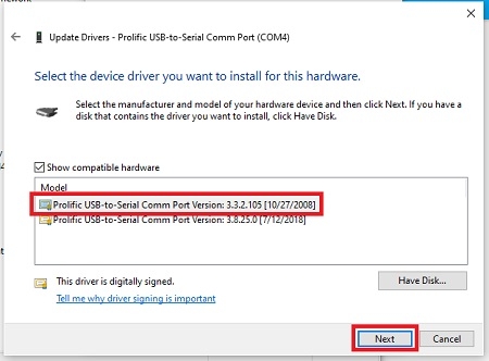 verze ovladače Prolific, které jsou ve vašem PC k dispozici. Vyberte verzi ze dne 27.10.2008,