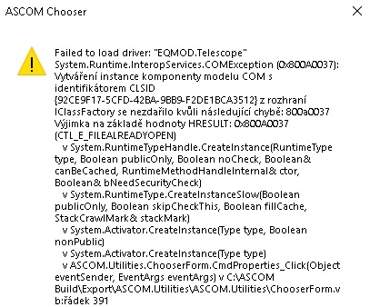 popsaným problémem. Při pokusu o připojení montáže u platformy ASCOM, získáte níže zobrazenou