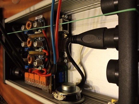 odběr 4A. Jako měniče napájení jsem použil moduly s čipem XL 4015, osazené chladičem. Ty disponují