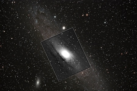 mnou pořízená fotografie galaxie M31 s Canonem a minimálním ořezem a ve středu v černobílém rámečku